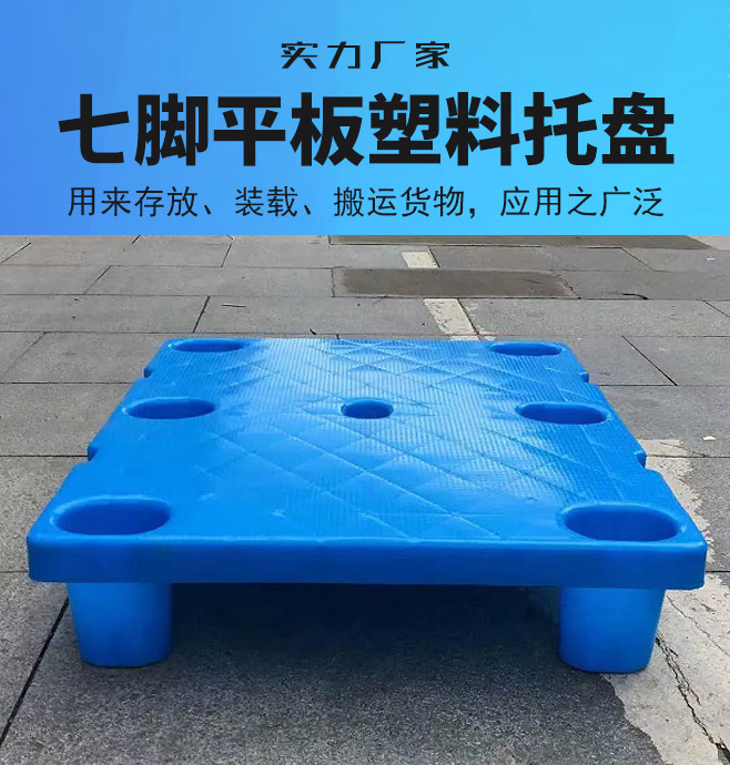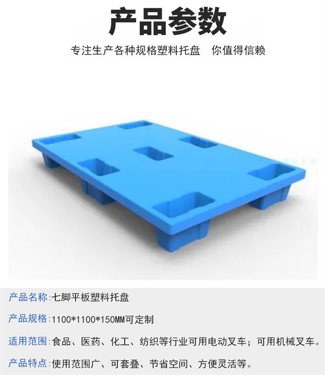 七腳平板塑料托盤的尺寸有1150*735*150mm,1150*725*150mm,1125*700*150mm,1200*800*150mm, 動載:1000kg,靜載:4000kg,貨架載:1000kg